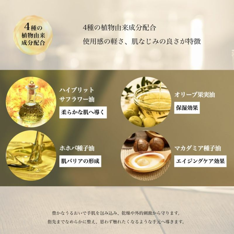 豊かなうるおいで手肌を包み込み、乾燥や外的刺激からあなたの手元をうるおい、守ります。